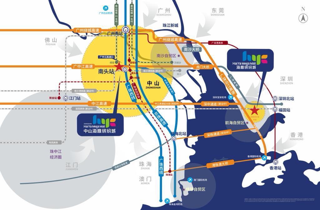 海雅繽紛城位於1小時廣深港中生活圈,直連廣珠城軌南頭站,是真的「輕軌上蓋」物業,一站到廣州南、三站直達香港西九龍。一百米內更對接廣珠西線廣中江雙高速南頭站出入口,車程約10分鐘直達順德大良,20分鐘直達廣州、中山、江門城區,40分鐘抵達深圳。海雅繽紛城位處的南頭鎮地處中山「北大門」,與佛山順德一水之隔,是中國家電品牌基地,鎮內聚集各類企業達4500間,其中上市公司有5間,億元以上企業70間,是中山經濟重鎮,發展潛力非常可觀。