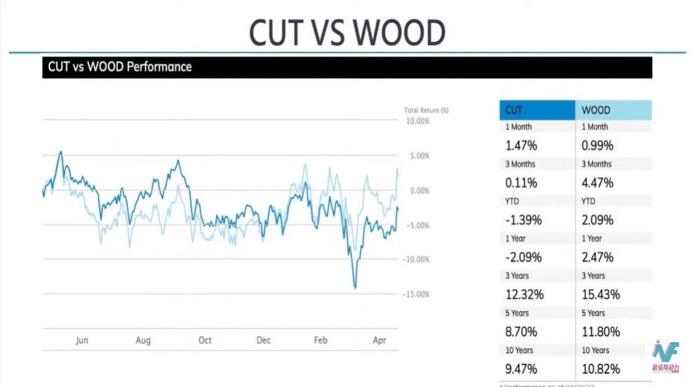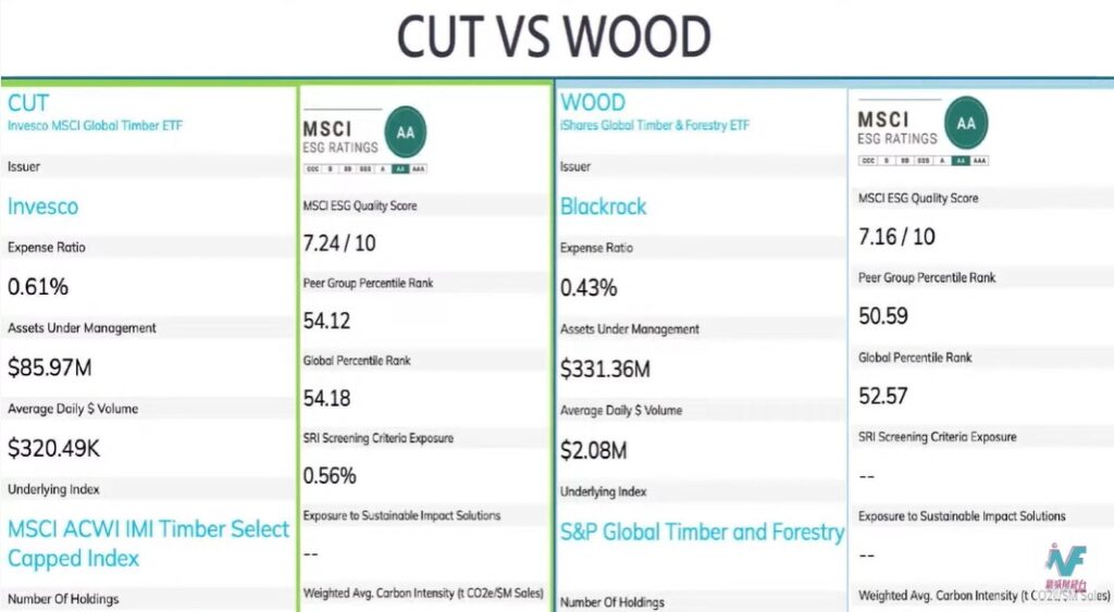 「Cut」是以木材、紙張等相關的包裝公司為主;「Wood」是以管理樹林的公司會主。雖然兩者同是木材相關ETF,但涵蓋公司有所不同,但選擇並沒有對錯,純粹是投資者個人喜好選擇。
