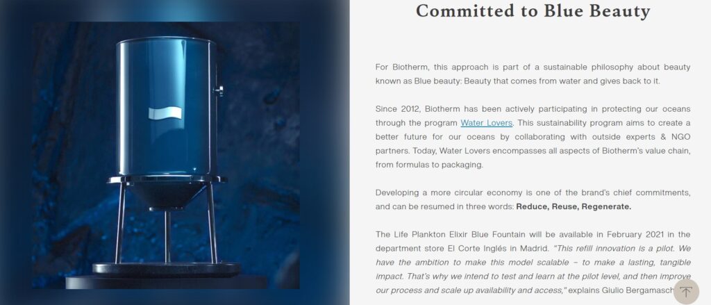 順帶一提,Biotherm在外國也在呼籲客人將用完的舊瓶,帶到店內重新注入新產品,實行「裸買」。由於化妝品或者護膚品,一旦開封接觸過空氣或者水份,會有細菌滋生,Biotherm會先幫客人的舊瓶,用特別機器進行消毒、風乾及UV消毒,再於密室空間重新將精華液等護膚品重新注入。以上的舉動是真正可推動客人一同去參予循環再用,而客戶也不用擔心衛生度。
