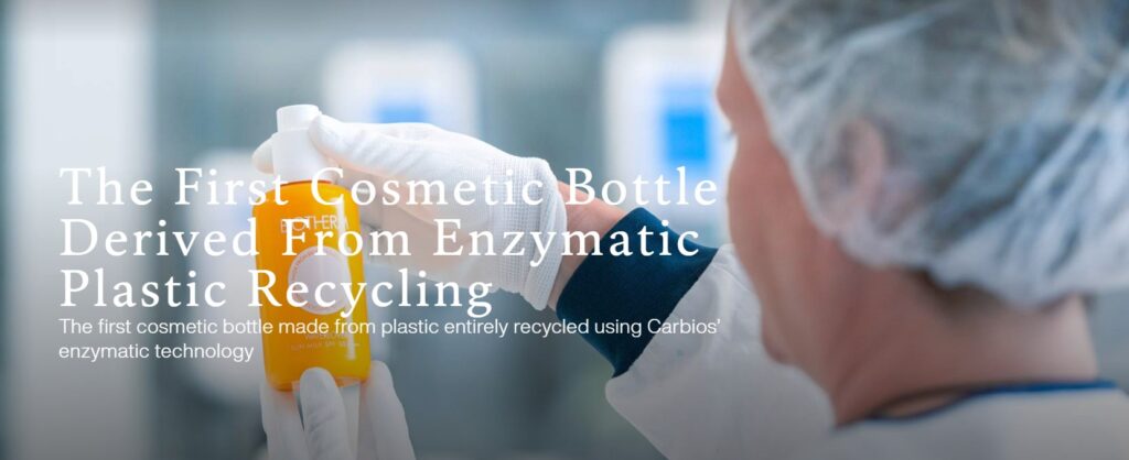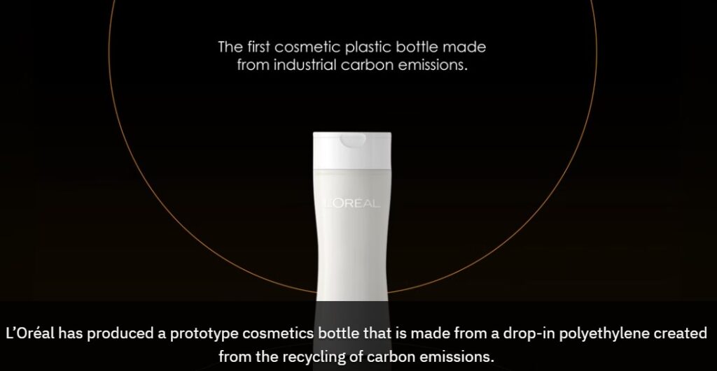 L’Oréal產品膠瓶是理用捕獲工業的碳排放去製成膠瓶,L’Oréal找來合作伙伴一同開發。首先捕獲了部份由工業產生的碳排放,經過一輪特別工藝將乙醇轉化成乙烯,然後將乙烯轉化成塑料包裝,變相將原本是污染物轉化成一個可用物料,造出來的膠樽就裝產品的容器,當然最後會將這些塑料亦可以再循環再用。而L’Oréal另一款產品,就將不同塑膠回收再重用,重新再造成新的膠瓶,甚至可以將本身非食用、護膚品級數的膠瓶,可能一些工業用膠物料都可以轉化食用裝或者化妝品容器。