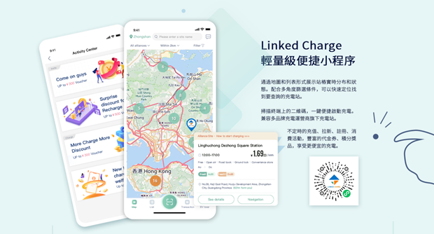 電動車車主泊車同時充電,數碼港培育計劃的初創兼智能充電科技初創「令狐充新能源」,提供自家手機應用程式「Linked Charge」,車主只要一App在手,便可尋找附近最適合的充電站,更附有遠程實時監控充電狀態的功能。以上的設施方便車主,規劃旅程時更得心應手!