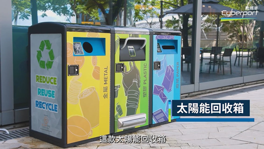 在收集太陽能的同時,原來可以物盡其用!數碼港第2期四樓的數碼港平台位置,安裝太陽能垃圾回收桶,附有感應器及壓實器,方便使用者掉垃圾零接觸;而且垃圾桶同時具有物聯網功能,能夠知道垃圾桶是否已滿,方便企業安排清潔人手,令更有效保持環境清潔。