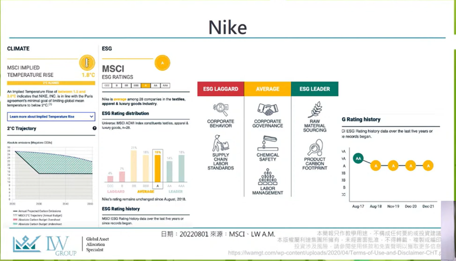 而Nike的ESG表現亦理想,不過在MSCI的評分數不及Adidas,只有A級, 但在碳排放方面控制得宜,與Adidas類似,介乎在1.8至2度之間。在MSCI評級中,化學安全性(chemical safrty)、勞工管理(labor management)、企業管治(corporarte governance)、及貨品生產的碳足跡(product cabrbon foodpring)等方面也控制得宜,但早前在採購物料或勞動基準方面,有負面新聞,因此在MSC1評分中說明,認為Nike比起同行,暫時做得不夠理想,尤其勞動基準方面表現比較差,評級由17年的AA級,下滑至18年時候的A級,到現在暫時未被再調高評級。