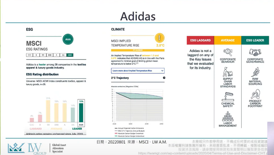 Adidas的在獨立ESG評分機構MSCI的評分,非常高分,達到AAA級水平,在控制埋碳減排方面達到1.5度至2度,表現不俗,MSCI也列舉了Adidas做得理想的項目,包括供應鏈的勞動基準(supply chain labour standards)、化學安全性(chemical safrty)、勞工管理(labor management)、企業管治(corporarte governance)、原材料採購(raw material sourcing)〕及貨品生產的碳足跡(product cabrbon foodpring)等方面均表現理想。