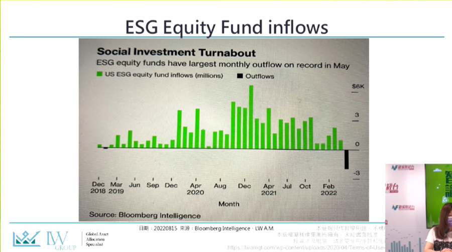 這個現象令大家可能以為ESG投資已經「賺夠離場」?而有研究顯示,市場開始進行做重新資金調配或減低風險的行情,所以ESG的ETF及其他產品資金流出,但其實6月份資金流已經又再慢慢再流入,當然不是立即暴升,但可見數據已回升,而6月份已再流入5億多美金,慢慢到7月份已穩步向上升,所以在質疑ESG的ETF現金流或投資上價值時,應該要留意一段時間,不可以只看短期。