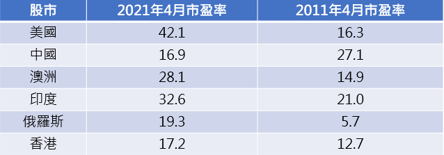 美國股市擁有最多科技股及高增長公司,它的市盈率相對應該是較高。用4月20號去做基準,美國的股市市盈率是42.1倍,相比起香港的17.2倍高出很多,但我們很難說美國的估值太高而不值得投資。