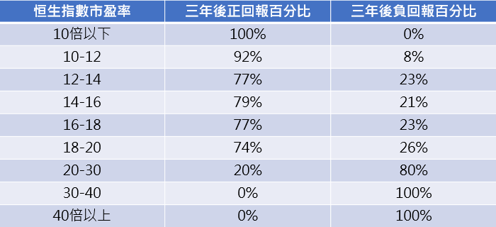 從這個統計去看,香港現在的股市的市盈率水平仍然吸引,中長線屬於值得持有。未來三年仍然有74%機會有正增長。