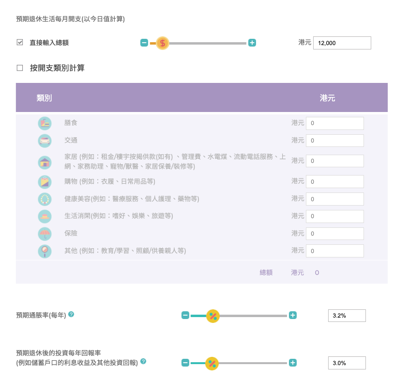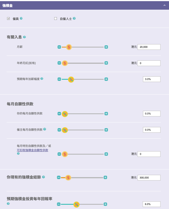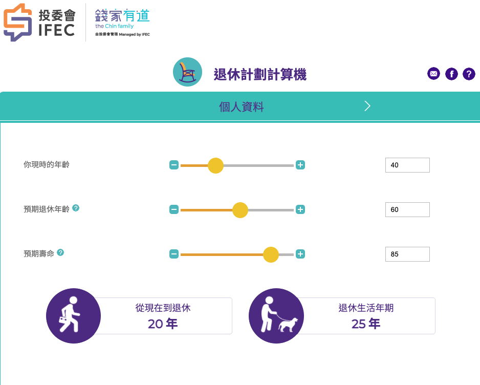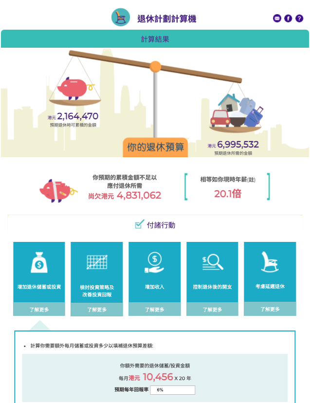 存多少錢才夠養老?在投委會「錢家有道」網站,使用「退休計劃計算機」,用一個40歲的人為例,月入2萬,目標60歲退休,而生活到85歲。預期退休後每月開支為現值12000。結果到60歲的時候,需要累積退休金約700萬。扣除MPF累積後,竟然還需要現金483萬。
