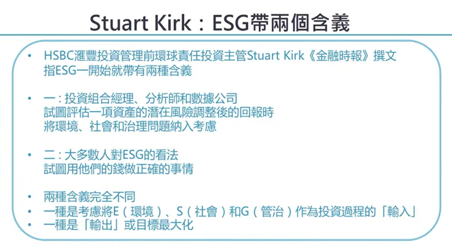 兩種ESG投資,第一種是現時大部分基金經理或者金融公司的操作,嘗試評估,究竟資產裏面潛在的ESG風險,會否影響到回報,而調整風險回報後,亦會將「環境、社會及管治」的ESG元素納入考慮;第二種是ESG的含義,Stuart Kirk 認為大多數人是試圖用錢去做正確事,但這樣可能加入個人喜好到投資裡,假如策劃人是不喜歡燒煤公司、對環境不利的公司或者和碳權上有裙帶關係的企業,或者因企業的高層人員不夠多元化,而決定不投資以上公司。Stuart Kirk 這兩種含義要分開,因為完全是不同,在Stuart Kirk 眼中,將第一種「環境、社會及管治」納入去投資過程考慮因素是一個「輸入」的情況,而第二種方法,Stuart Kirk認為策劃人如只因個人喜好的ESG目標或社會價值觀而做ESG,是一個「輸出」做法,是「目標最大化」做法。