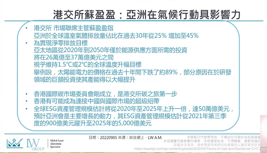 ESG、資產管理等概念由2020年開始有人談及,近年更多人討論、市場上亦有ETF等,但現時全球ESG資產規模,曾有統計預計,由2020年至2025年,會上升一倍,達至50萬億美元,預計亞洲是其中一個增長動力。而香港在ESG方面亦算努力,香港很多公司方面因要提交ESG報告,令大眾關注多了,但投資者仍在理解中。另外,市場成熟度也會影響投資者,更容易啲理解ESG。