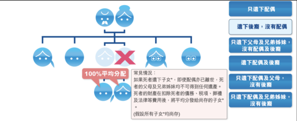 2. 遺下後裔,沒有配偶:後裔平均分配繼承遺產