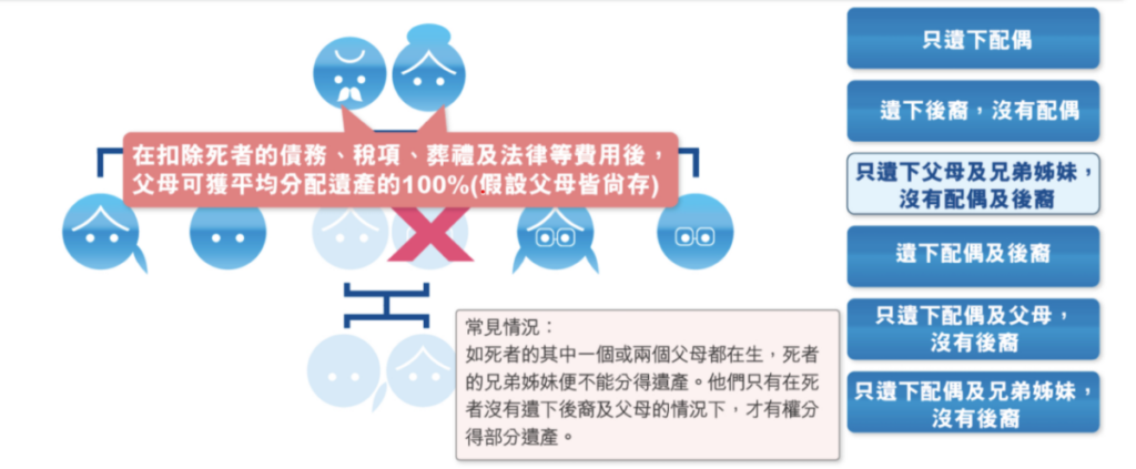 3. 只遺下父母及兄弟姊妹,沒有配偶及後裔:父母平均分配繼承遺產
