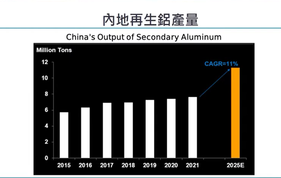 |數據顯示,現時內地再生鋁產量,製作過程消耗能源比原鋁生產,低至九成半,原鋁生產消耗能源咧,比起再生鋁低95%,明顯可見將來市場對追求碳排放的時候,再生鋁需求也會在明顯增長。