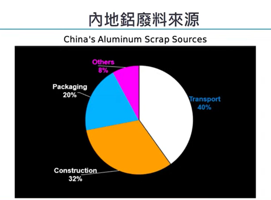 再生鋁的廢料方面,主要來自包裝佔兩成多,最明顯多是建築、汽車及電子產品廢料佔最多,建築廢料佔32%,而汽車廢料佔40%,以上也是再生鋁的主要廢料成份,另外,家電、電器、手機、電視機、雪櫃等,也是再生鋁原材料。而截至「十四五規劃」期間,有報告數據,每年廢品供應會達到1500萬噸,希望可以回收令到鋁循環再用,希望內地發展綠色經濟,而內地再生鋁廢料原料是來自不同地方,尤其建築和車是一個很龐大的廢料來源。