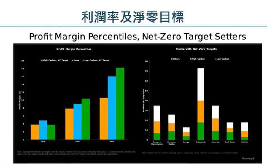 由數據可見,碳排放目標或者碳排放量數會影響到公司利潤率,長遠會影響埋公司盈利情況。另外,右圖列出有那些行業有比較多淨零排放目標,如有訂立淨零排放目標的工業,始終高碳公司成份都比較多。而必需性消費類股(consumer discretionary)或者效用(utility)相對地比較少。