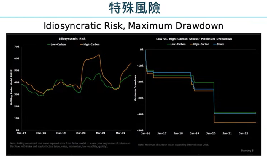 而彭博的指數也展示出高碳公司和低碳公司比較,在特殊風險上分野越來越大,在面對特殊風險時,高碳公司明顯比較高及波動較大幅度,明顯在面對特殊風險會越來越多。接下的COP27,會談及各國如何落實碳排放政策,也是令高碳公司,面對風險增加。