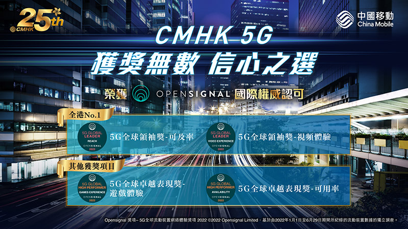 於2021年6月,CMHK客戶規模突破500萬,與此同時CMHK獲得國際知名獨立網速測試平台Speedtest頒發「全港最快5G網絡 – 2021年大獎」,今年年中5G客戶規模亦已突破160萬。此外,CMHK 5G網絡亦蜚聲國際再獲殊榮,膺另一個業界權威Opensignal® 認可,於2022上半年5G網絡可及率及5G視頻體驗全港No.1,同時名列世界前茅,分別排名全球第二(Joint Winner)及第七(Joint Winner),成績斐然。