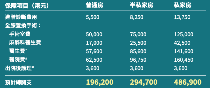 長痛不如短痛,很多人會找私家醫院盡快進行手術。雖然不少市民已經投保了醫療保險,但是仍然擔心手術費貴,擔心超出保障範圍。在此用大約的「全膝置換手術」收費讓讀者參考。這個手術通常在保險公司屬於特級大型手術,而現在流行投保的全額支付型的醫療保險,只是在過去十年才出現。如果是早期投保了每項使費有限額的“傳統型”醫療保險,保險範圍會分開病房費、醫生費、麻醉師費、手術室費、雜費等,讀者可以根據自己醫療保險範圍,做一個“賠償壓力測試”,看看能賠付多少,心中有數。