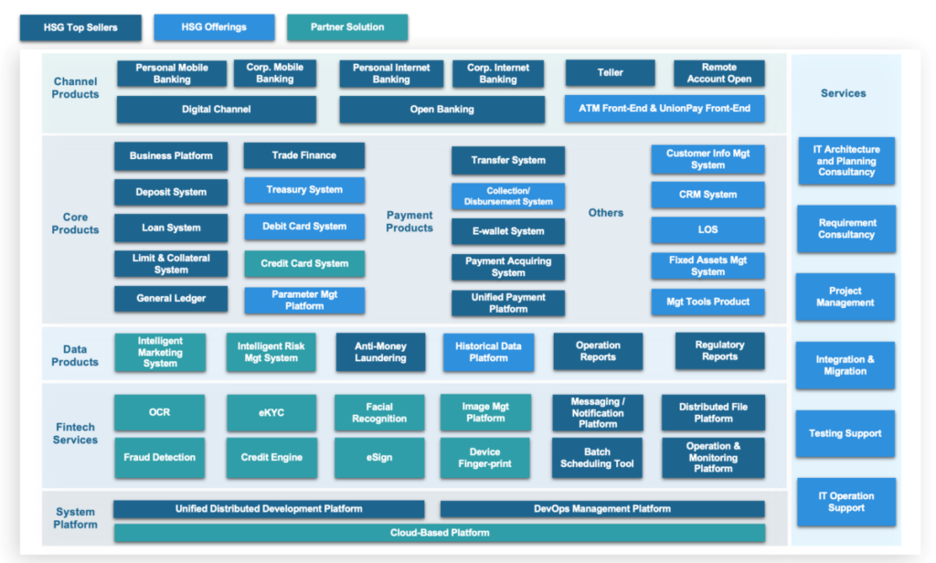 談及HSG所提供的產品及服務,當然亦不得不提其銀行核心系統(Core Banking)及電子銀行,就好像大眾日常都經常接觸到的網上銀行、銀行手機應用程式等。「我們亦會與不同渠道的伙伴合作,提供全方位的客戶服務,包括人臉辨識(eKYC)、光學字元辨識(OCR)等等,又或是電子錢包、電子借貸、監管報表及其他的數碼解決方案。」