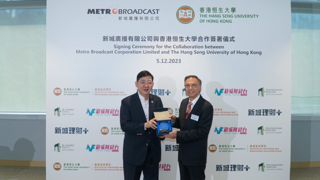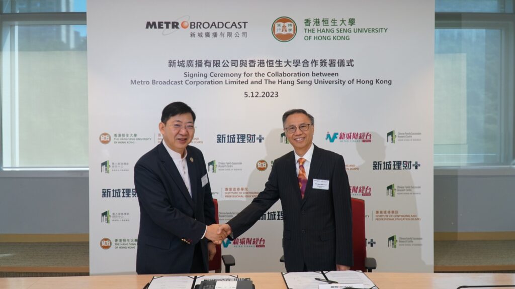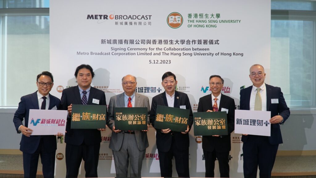 香港恆生大學與新城廣播有限公司於12月5日在恆生大學袁炳濤校園利國偉教學大樓李秉源會議廳舉行合作協議簽署儀式,開展為期兩年的合作計劃。雙方將共同推動華人家族傳承的應用研究和知識交流,令家族企業成員、新世代資產擁有人、國際家族辦公室管理人、財富管理從業員和大眾市民能更好掌握家族傳承概念和相關設置,例如家企管治與家族辦公室。