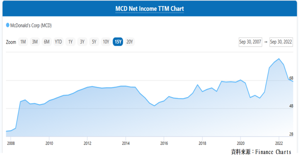 麥當勞過往盈利和派息大致都能保持增長,股價也不算太波動,由於業務穩定,投資者可以利用月供或分注模式儲貨,現時市盈率約35倍,如果用滾動市盈率(TTM)計算約26倍(TTM:即是當有最新一季的盈利數據就會採用,並取代最早一季數據)。