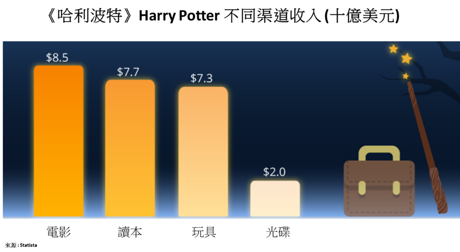 從上圖可以看到,讀本和電影可以說是最直接把創作出來的故事變現的方法。單單讀本,全球就已經賣了超過6億本了。電影方面,更花了超過10年的時間把7本故事製作成8部電影,成就了85億美元的全球票房。但更令人吃驚的是,它所引伸出來的玩具 (包括電腦遊戲)亦可以達到相近的收入規模 ! 看看你們家裡,應該也可以找到一兩枝魔法棒吧(一笑)。這裡還未計算在運在建有關故事的主題公園和體驗場館呢 ! 這種生生不息的變現能力叫人驚訝。