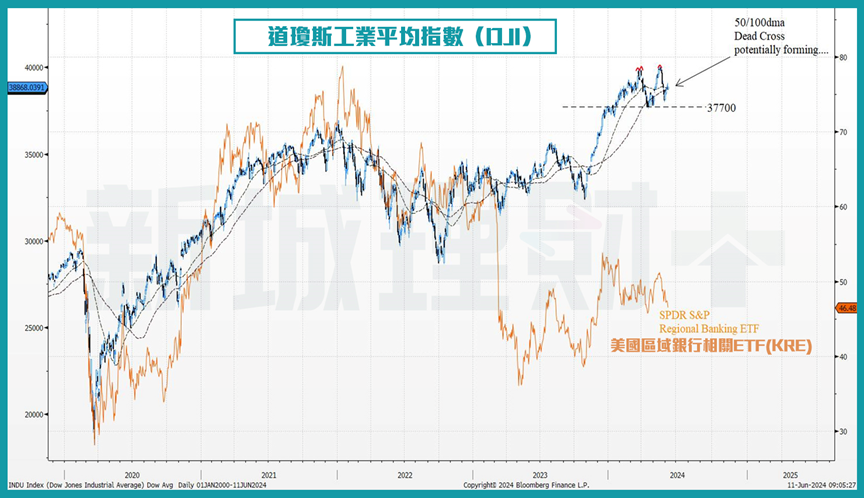 換言之,如果美國債息持續向上,而假設其他因素不變,KRE的股價將會向下突破重要圖表支持位的同時,道瓊斯工業指數在醞釀雙頂形態中, 亦會自去年12月中首次出現「50/100天」死亡交叉,不單導致道瓊斯工業指數再次下試38,000點的機會將會大大提高,遇到時候沒有新的好消息,筆者不排除道瓊斯工業指數會下見37,000點。 市場如何反映今週聯儲局議息會議和美國通脹數據,將會對於道瓊斯工業指數短期走勢提供重要指引。