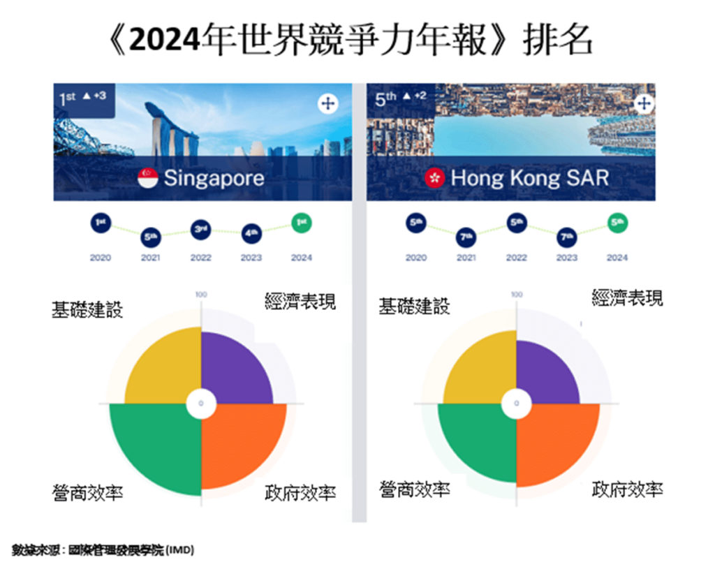在國際管理發展學院(IMD)發布的《2024年世界競爭力年報》中,經過4個競爭力因素綜合考量,香港的全球競爭力達到世界前五,跟「世一」新加坡的距離在收窄。因此,筆者相信我們是有條件翻盤的。