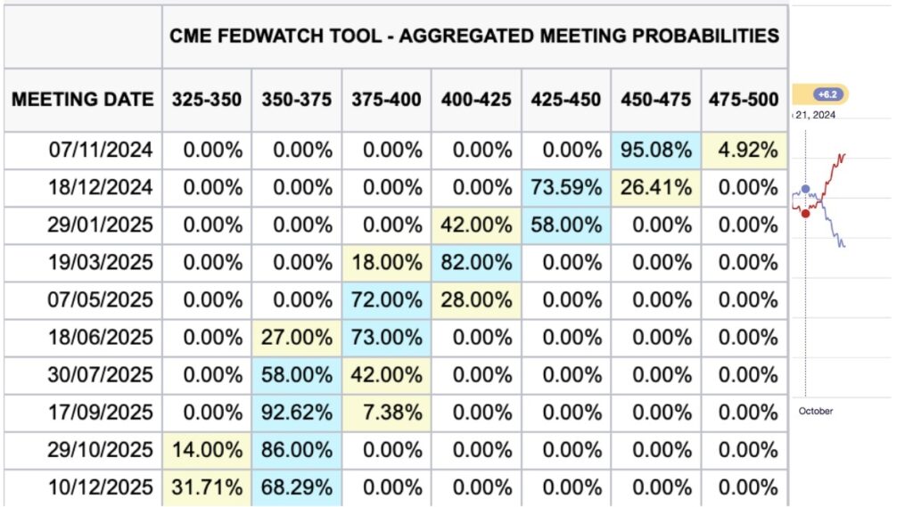 經濟數據強勁:近期9月非農就業數據、零售銷售等經濟指標大幅優於市場預期。有投資人擔心聯儲局降息50個基點幅度過大,導致進一步降息的預期降低。雖然 11 月會議降息 25 個基點的可能性為 95%,但 12 月會議進行類似降息的可能性已降至 73.4%。市場也預計聯儲局在2025年1月的會議上暫停升息的可能性為58%。