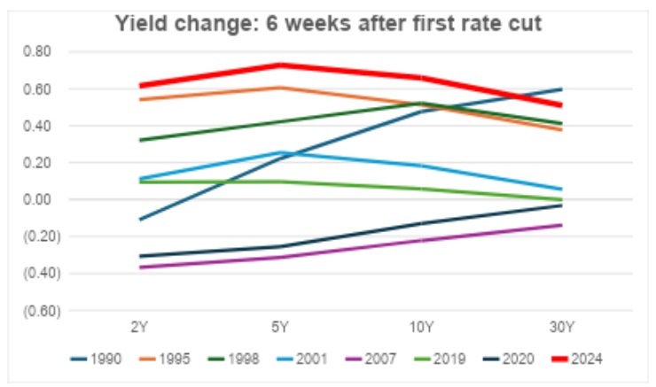 自1990年以來,聯儲局已經實施了八次降息週期。我們對首次降息六週後孳息曲線變化的研究表明,在這八個週期中的六個週期中,中期(例如 2 年期、5 年期)和長期國債利率(例如 10 年期、 30年)普遍上漲。在這些情況下,中期收益率的增幅往往高於長期收益率,包括 2024 年的情況。