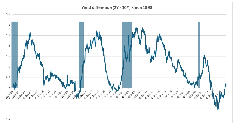 2年期-10年期國債利率利差是評估孳息曲線陡度的常用指標。自1990年以來,已有五個時期2Y-10Y利差轉為負值,包括最近的一個時期是2022年7月至2024年8月。 2000年、2007年),2Y-10Y利差大約需要 2.5 至 3.0 年才能達到最高 250 bps。 2019年是個例外,利差在1.5年內擴大至僅150個基點,這主要是由於聯儲局激進的量化寬鬆政策(Quantitative Easing, QE)扭曲了孳息曲線的陡度。