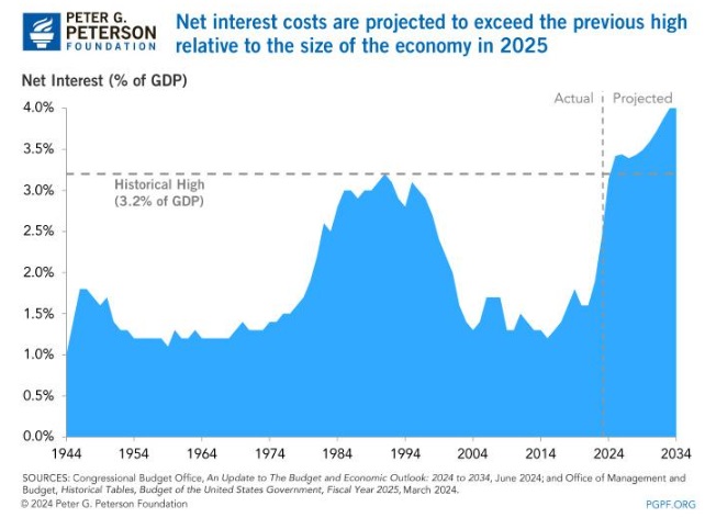 • 財政赤字惡化:2024 年 6 月,美國國會預算辦公室 (CBO) 預計預算赤字為 1.9 兆美元,債務總額達到 28.2 兆美元,相當於 GDP 的 99%。 CBO也預測,淨利息成本佔GDP的比例將在2025年超過先前高點3.2%。