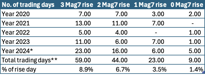 表:SPX與Mag7上漲一定次數之間的交易日數