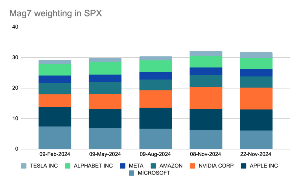 整個2024年,Mag7在SPX的權重從2月份的29.2%上升到11月初的峰值32.2%。特朗普當選後,這項權重在11 月22 日跌至31.8%。跌幅最大的是微軟(下降 1.24%)、Alphabet(下降 0.24%)和 META(下降 0.04%)。如果沒有 Nvidia 強勁的權重增益,Mag7 的整體權重將會下降 0.54%,達到 SPX 的 24.5%。