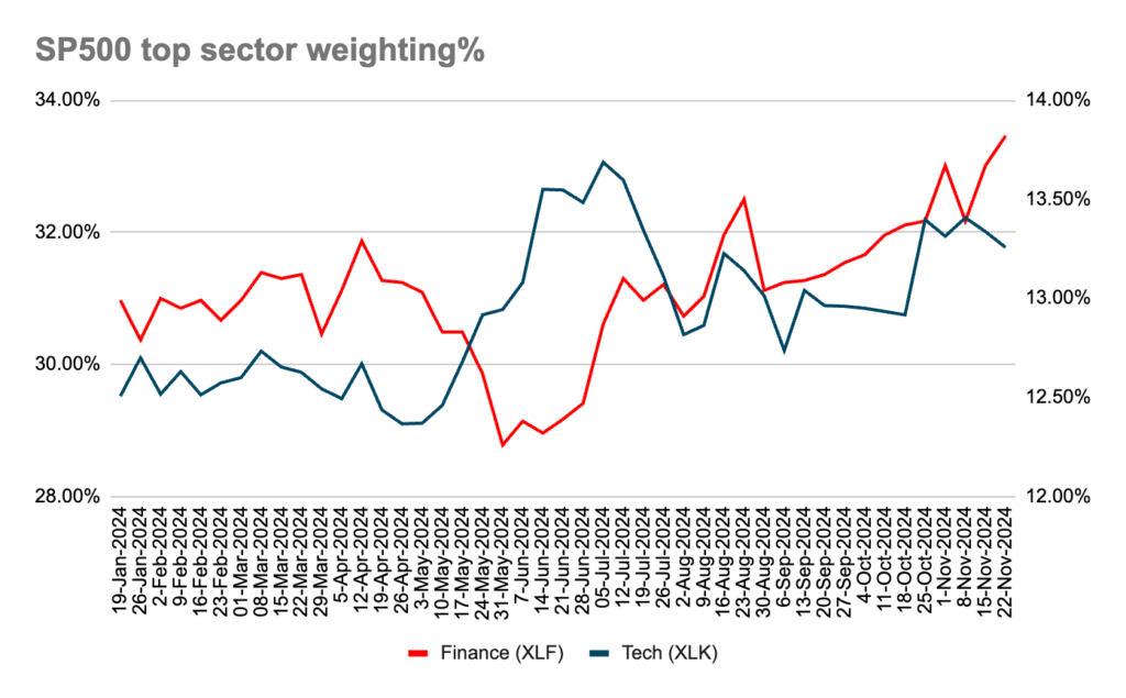 首先,金融板塊在指數中處於領先地位,而科技板塊則表現不佳。 SPX權重觸底後,金融板塊從5月的12.26%上升至11月的13.82%並持續上升,而科技板塊權重從7月的峰值33.06%下降至11月的31.77%。