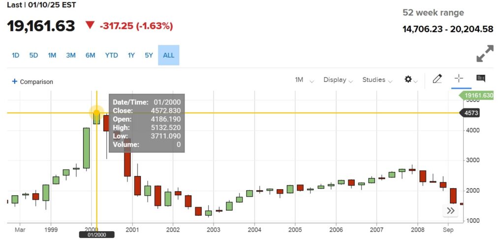 牛市見頂,往往都會有人踏人的情況,投資者們在不問價的情況下沽出大量持股,是常有發生的事。在上一次2000年科網熱的時候,納指在2000年3月10日錄得的高位是5132.52點,之後30個月內累跌78%,等到2015年才重新升穿5132.52點。