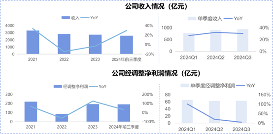 2021至2023年,公司收入從3286億元下滑至2710億元。2024前三季度,公司實現收入2569億元,同比增長29.37%。2024Q3單季度,公司實現收入925億元,同比增長30%,環比增長4%,創歷史新高。在經調整淨利潤方面,2024Q3單季度,公司實現經調整淨利潤63億元,同比增長4.4%,其中包括智慧電動汽車等創新業務經調整淨虧損15億元。