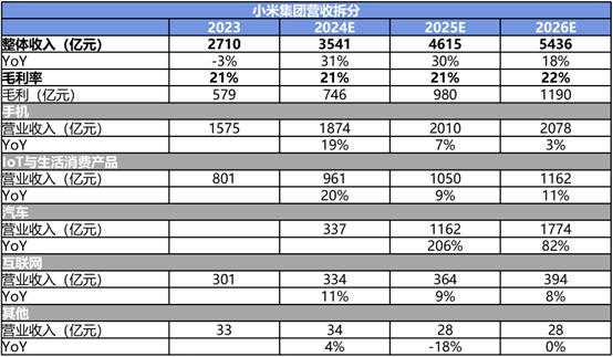 2024年第三季度,小米集團智能電動汽車收入約95億元,毛利率約17%,超過部分同行。2024年,小米集團全年交付超過13.5萬輛,目標2025年交付30萬輛。預計2026年小米集團汽車收入約1774億元。