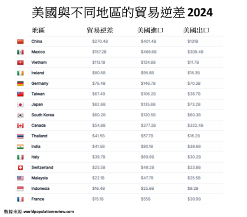 從上圖不難看到,美國上周宣佈收取的關稅比率,跟不同地區的貿易逆差息息相關,提高關稅的意圖明顯。例如,越南這次被徵收的關稅比率為46%,在各個地區中排名第三,亦反映她在貿易逆差的順序。因此,高關稅是一種手段以圖改變現況。