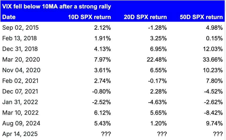 過去10年中,VIX曾11次突破30水準(包括2025年4月)。 從歷史上看,在如此強勁的反彈之後,VIX 逐漸跌破其 10 天移動平均線 (10MA),這是一個可靠的 SPX 買入訊號——勝率(win ratio)為 80%。 不過,也有兩個例外:2021 年 12 月和 2022 年 1 月,市場達到高峰,然後進入整年熊市。