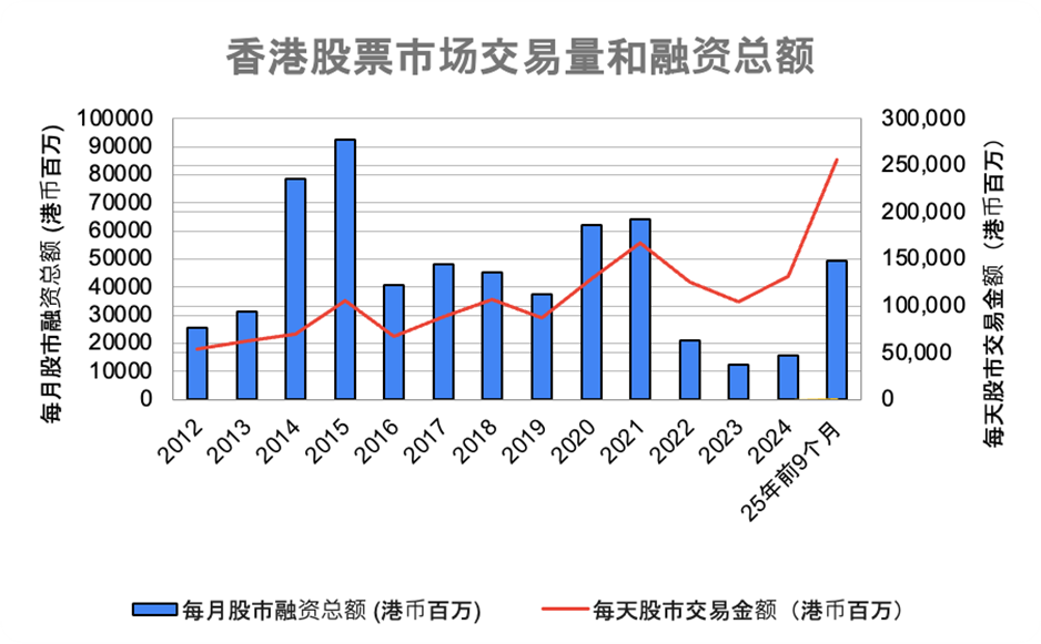 2025年前九個月,香港股市強勁反彈,恒生指數上漲37%。截至2025年9月底,總市值達49.9兆港元(約5.47兆美元),較第二季末成長17%,較2024年同期成長35%,2024年全年成長41%。