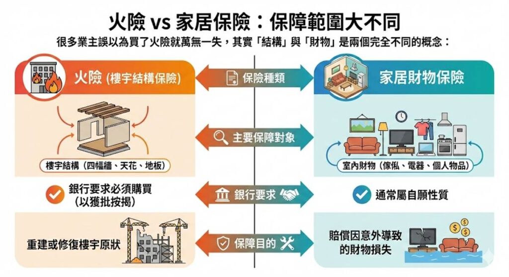 很多業主誤以為買了火險就萬無一失,其實「結構」與「財物」是兩個完全不同的概念: