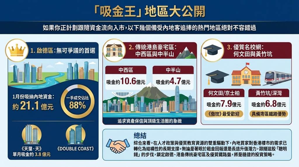 作為香港近年最重要的核心商住發展區,啟德區成功登上「吸金王」寶座。1 月份該區吸納了約 21.1 億元內地資金,當中高達 88% 屬於一手成交。區內指標性新盤如《天璽.天》(單月吸金約 3.8 億元)及《DOUBLE COAST》等,均是市場的搶手貨。