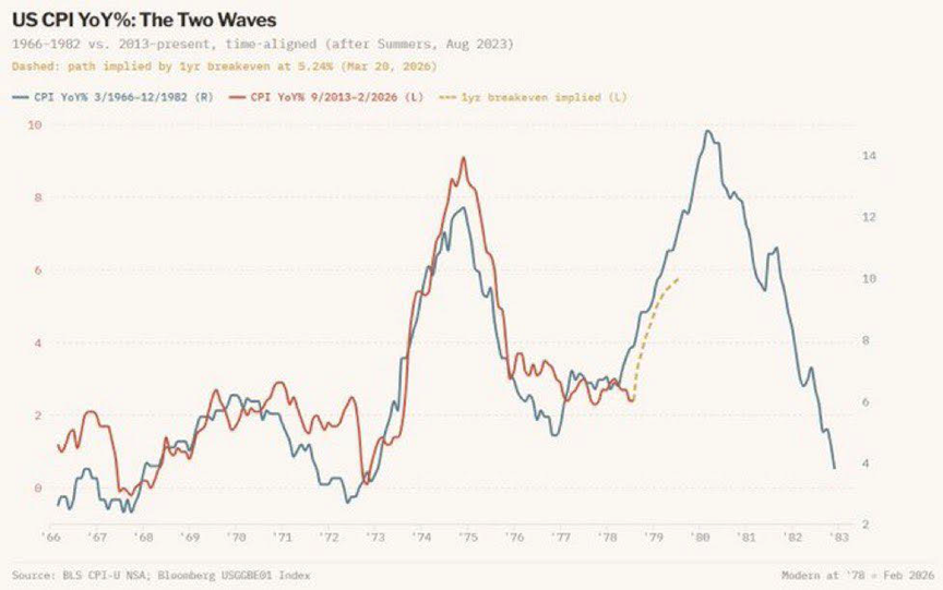 由減息變加息,對資產市場影響之大不容忽視,特別是息口敏感股,包括銀行、高息、地產甚至是美國科技股。筆者在節目多次強調,美國息口與1970至1980年代相似【圖】,即是會出現第二個高峰,最新美國通脹己壓不下去,按年升幅僅在2.5%浮沉,但此數未計入近日油價急升,故此往後計及油價因素後,通脹壓力絶對不細。